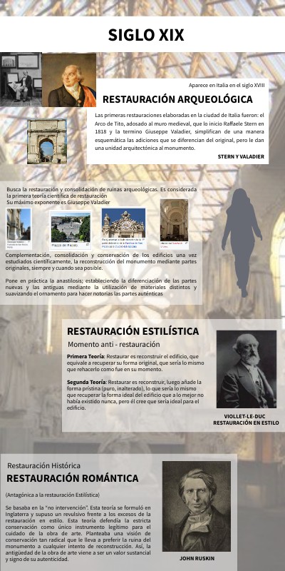 INVESTIGAR SOBRE LA EVOLUCIÓN HISTÓRICA DE LA RESTAURACIÓN EN EL SIGLO XIX Y XX Y REALIZAR UNA INFOGRAFÍA POR SIGLO ELABORADA CON LA HERRAMIENTA DIGITAL GENIALLY, REALIZAR UNA SÍNTESIS POR CADA TEÓRICO Y SUS PRINCIPALES APORTES.