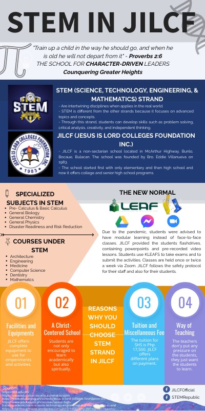 https://jilcf.edu.ph/https://www.education.wa.edu.au/what-is-stem https://www.edukasyon.ph/schools/jesus-is-lord-colleges-foundation-inc https://www.edukasyon.ph/courses/senior-high- tracks/academic/stem-science-technology-engineering-and-mathematics-strand https://krishthoughtssite.wordpress.com/2017/10/22/why-jilcf-top-ten-reasons/