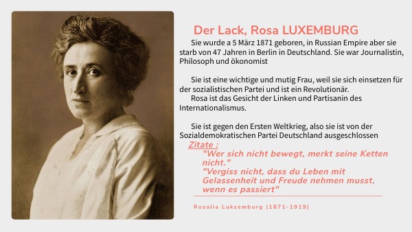 Sie wurde a 5 März 1871 geboren, in Russian Empire aber sie starb von 47 Jahren in Berlin in Deutschland. Sie war Journalistin, Philosoph und ökonomist Sie ist eine wichtige und mutig Frau, weil sie sich einsetzen für der sozialistischen Partei und ist ein Revolutionär. Rosa ist das Gesicht der Linken und Partisanin des Internationalismus. Sie ist gegen den Ersten Weltkrieg, also sie ist von der Sozialdemokratischen Partei Deutschland ausgeschlossen