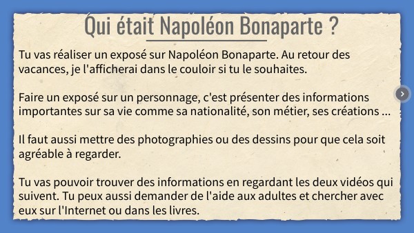 Tu vas réaliser un exposé sur Napoléon Bonaparte. Au retour des vacances, je l'afficherai dans le couloir si tu le souhaites. Faire un exposé sur un personnage, c'est présenter des informations importantes sur sa vie comme sa nationalité, son métier, ses créations ... Il faut aussi mettre des photographies ou des dessins pour que cela soit agréable à regarder. Tu vas pouvoir trouver des informations en regardant les deux vidéos qui suivent. Tu peux aussi demander de l'aide aux adultes et chercher avec eux sur l'Internet ou dans les livres.