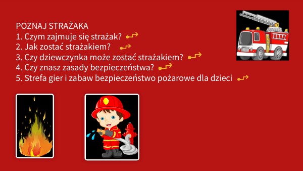 POZNAJ STRAŻAKA 1. Czym zajmuje się strażak? 2. Jak zostać strażakiem? 3. Czy dziewczynka może zostać strażakiem? 4. Czy znasz zasady bezpieczeństwa? 5. Strefa gier i zabaw bezpieczeństwo pożarowe dla dzieci