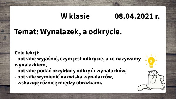 Cele lekcji: - potrafię wyjaśnić, czym jest odkrycie, a co nazywamy wynalazkiem, - potrafię podać przykłady odkryć i wynalazków, - potrafię wymienić nazwiska wynalazców, - wskazuję różnicę między obrazkami.