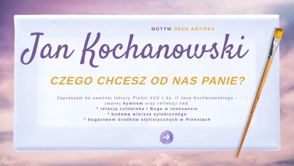 Zapraszam do uważnej lektury Pieśni XXV z ks. II Jana Kochanowskiego - zwanej hymnem oraz refleksji nad:* relacją człowieka i Boga w renesansie * budową wiersza sylabicznego * bogactwem środków stylistycznych w Pieśniach