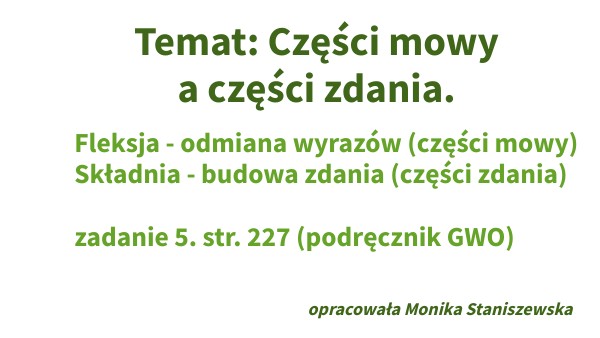 Fleksja - odmiana wyrazów (części mowy) Składnia - budowa zdania (części zdania) zadanie 5. str. 227 (podręcznik GWO)