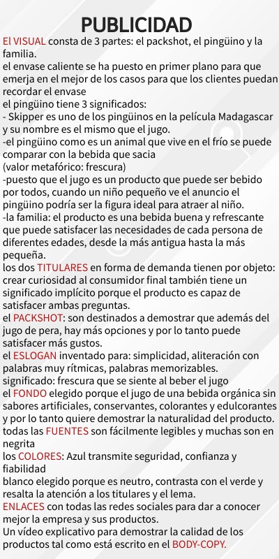 El VISUAL consta de 3 partes: el packshot, el pingüino y la familia. el envase caliente se ha puesto en primer plano para que emerja en el mejor de los casos para que los clientes puedan recordar el envase el pingüino tiene 3 significados: - Skipper es uno de los pingüinos en la película Madagascar y su nombre es el mismo que el jugo. -el pingüino como es un animal que vive en el frío se puede comparar con la bebida que sacia (valor metafórico: frescura) -puesto que el jugo es un producto que puede ser bebido por todos, cuando un niño pequeño ve el anuncio el pingüino podría ser la figura ideal para atraer al niño. -la familia: el producto es una bebida buena y refrescante que puede satisfacer las necesidades de cada persona de diferentes edades, desde la más antigua hasta la más pequeña. los dos TITULARES en forma de demanda tienen por objeto: crear curiosidad al consumidor final también tiene un significado implícito porque el producto es capaz de satisfacer ambas preguntas. el PACKSHOT: son destinados a demostrar que además del jugo de pera, hay más opciones y por lo tanto puede satisfacer más gustos. el ESLOGAN inventado para: simplicidad, aliteración con palabras muy rítmicas, palabras memorizables. significado: frescura que se siente al beber el jugo el FONDO elegido porque el jugo de una bebida orgánica sin sabores artificiales, conservantes, colorantes y edulcorantes y por lo tanto quiere demostrar la naturalidad del producto. todas las FUENTES son fácilmente legibles y muchas son en negrita los COLORES: Azul transmite seguridad, confianza y fiabilidad blanco elegido porque es neutro, contrasta con el verde y resalta la atención a los titulares y el lema. ENLACES con todas las redes sociales para dar a conocer mejor la empresa y sus productos. Un vídeo explicativo para demostrar la calidad de los productos tal como está escrito en el BODY-COPY.