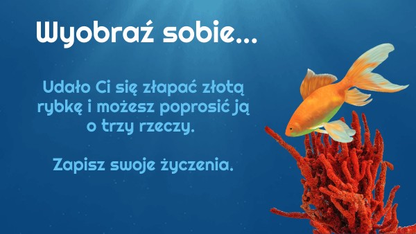 Udało Ci się złapać złotą rybkę i możesz poprosić ją o trzy rzeczy. Zapisz swoje życzenia.