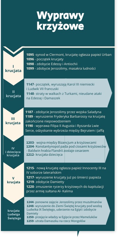 1095 -synod w Clermont, krucjatę ogłasza papież Urban 1096 - początek krucjaty 1098 - zdobycie Edessy i Antiochii 1099 - zdobycie Jerozolimy, masakra ludności