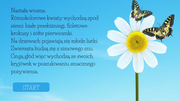 Nastała wiosna. Różnokolorowe kwiaty wychodzą spod ziemi: białe przebiśniegi, fioletowe krokusy i żółte pierwiosnki. Na drzewach pojawiają się młode listki. Zwierzęta budzą się z zimowego snu. Czują głód więc wychodzą ze swoich kryjówek w poszukiwaniu smacznego pożywienia.