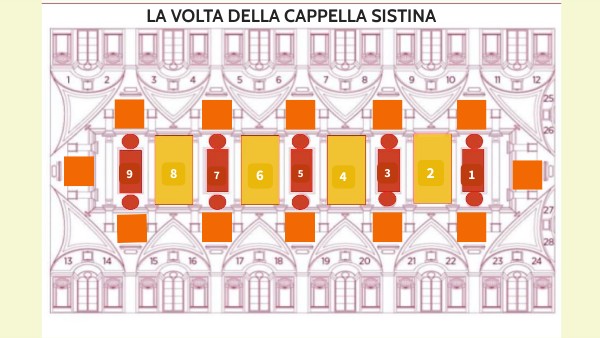 Adamo si trova sdraiato su un piccolo spazio erboso, mentre Dio arriva dal cielo, circondato dagli angeli, tutti insieme contenuti all’interno di un nimbo angelico; facendo bene attenzione, è possibile notare che lo stesso nimbo ricorda molto da vicino la forma del cervello umano, e metaforicamente potrebbe indicare l’idea della creazione di Adamo da parte di Dio.La suggestiva posizione dei due protagonisti, con le braccia tese ed un momento prima di toccarsi, rappresenta in modo eccezionale la forza della scintilla della creazione divina, che passa da Dio alla sua “creatura”, e quest’ultimo, riflette lo stesso movimento, risvegliando la forza di Dio. Spostando la nostra attenzione su Adamo, è possibile notare che tutto il suo corpo è stato affrescato in modo perfetto sotto un punto di vista anatomico