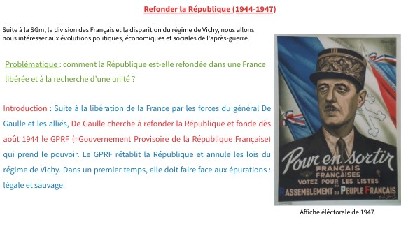 Introduction : Suite à la libération de la France par les forces du général De Gaulle et les alliés, De Gaulle cherche à refonder la République et fonde dès août 1944 le GPRF (=Gouvernement Provisoire de la République Française) qui prend le pouvoir. Le GPRF rétablit la République et annule les lois du régime de Vichy. Dans un premier temps, elle doit faire face aux épurations : légale et sauvage.