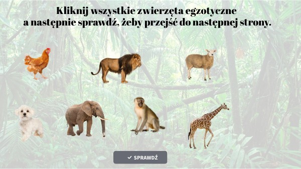 Kliknij wszystkie nazwy zwierząt egzotycznych, a następnie sprawdź, żeby przejść do kolejnej strony.