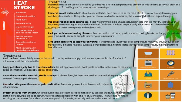 Heatstroke treatment centers on cooling your body to a normal temperature to prevent or reduce damage to your brain and vital organs. To do this, your doctor may take these steps: Immerse in cold water. A bath of cold or ice water has been proved to be the most effective way of quickly lowering your core body temperature. The quicker you can receive cold water immersion, the less risk of death and organ damage. Use evaporation cooling techniques. If cold water immersion is unavailable, health care workers may try to lower your body temperature using an evaporation method. Cool water is misted on your body while warm air is fanned over you, causing the water to evaporate and cool your skin. Pack you with ice and cooling blankets. Another method is to wrap you in a special cooling blanket and apply ice packs to your groin, neck, back and armpits to lower your temperature. Give you medications to stop your shivering. If treatments to lower your body temperature make you shiver, your doctor may give you a muscle relaxant, such as a benzodiazepine. Shivering increases your body temperature, making treatment less effective.