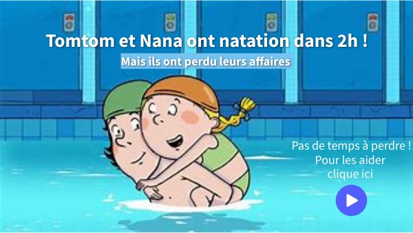 Tomtom et Nana doivent retrouver leurs affaires. Ils font plein d'activités et sont allés dans tout Chilly Mazarin. Il faut que tu les aides à fouiller les gymnases pour retrouver leur équipement de natation. Ils n'ont que leur sac de sport . Tu dois trouver 7 éléments. Ils comptent sur toi pour le remplir. En plus aujourd'hui, c'est l'évaluation. Pour réussir votre mission RDV à la piscine dans 2h en tenue ! Cela ne sera pas si simple, des aventures sportives t'attendent... Conseil : munis toi d'un papier et d'un crayon . Clique sur Tomtom et Nana pour démarrer!