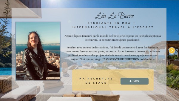 Attirée depuis toujours par le monde de l'hôtellerie et pour les lieux d'exception & de charme, ce secteur m'a toujours passionné ! Pendant mes années de formations, j'ai décidé de m'ouvrir à tous les horizons, pour ne me fermer aucune porte, et c'est au fur et à mesure de mes expériences professionnelles et des projets réalisés au sein des écoles, que je me tourne aujourd''hui vers un stage d'ASSISTANTE DE DIRECTION en hôtellerie