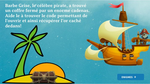Barbe Grise, le célèbre pirate, a trouvé un coffre fermé par un enorme cadenas. Aide le à trouver le code permettant de l'ouvrir et ainsi récupérer l'or caché dedans!
