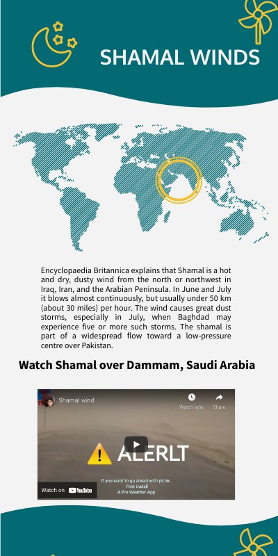 Encyclopaedia Britannica explains that Shamal is a hot and dry, dusty wind from the north or northwest in Iraq, Iran, and the Arabian Peninsula. In June and July it blows almost continuously, but usually under 50 km (about 30 miles) per hour. The wind causes great dust storms, especially in July, when Baghdad may experience five or more such storms. The shamal is part of a widespread flow toward a low-pressure centre over Pakistan.