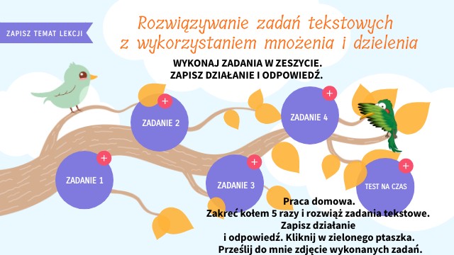 Praca domowa. Zakreć kołem 5 razy i rozwiąż zadania tekstowe. Zapisz działanie i odpowiedź. Kliknij w zielonego ptaszka. Prześlij do mnie zdjęcie wykonanych zadań.