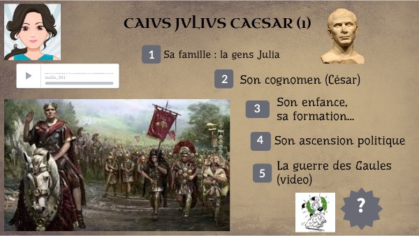 Le jeune César bénéficie de cours particuliers qui ont lieu dans sa propre maison. À partir de 12 ans, un « grammaticus » lui enseigne la littérature en lati et en grec... Son père meurt subitement un matin de 85 av. J.-C. en mettant ses chaussures; César a 14 ans. À partir de 16 ans, ses études l'orientent vers une carrière politique; il étudie la rhétorique (art de maîtriser la parole). À côté de cet enseignement intellectuel, il reçoit une formation militaire : il s'initie aux techniques de combat mais aussi à la tactique et à la stratégie. Il sera un parfait athlète, pratiquant aussi bien l'équitation que l'athlétisme ou la natation.