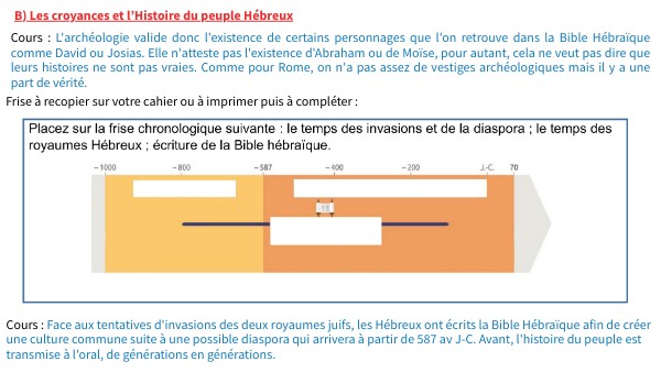 Cours : Face aux tentatives d'invasions des deux royaumes juifs, les Hébreux ont écrits la Bible Hébraïque afin de créer une culture commune suite à une possible diaspora qui arrivera à partir de 587 av J-C. Avant, l'histoire du peuple est transmise à l'oral, de générations en générations.