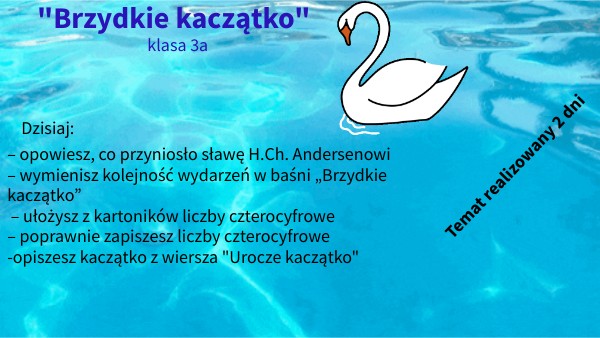 – opowiesz, co przyniosło sławę H.Ch. Andersenowi – wymienisz kolejność wydarzeń w baśni „Brzydkie kaczątko” – ułożysz z kartoników liczby czterocyfrowe – poprawnie zapiszesz liczby czterocyfrowe -opiszesz kaczątko z wiersza "Urocze kaczątko"