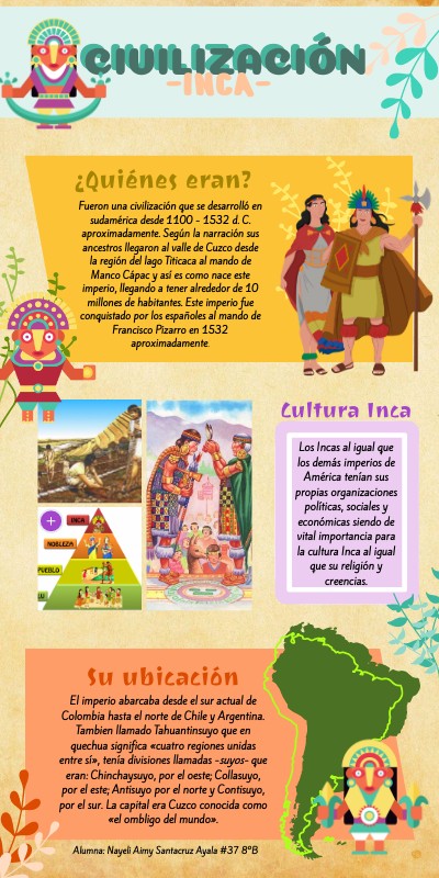 Fueron una civilización que se desarrolló en sudamérica desde 1100 - 1532 d. C. aproximadamente. Según la narración sus ancestros llegaron al valle de Cuzco desde la región del lago Titicaca al mando de Manco Cápac y así es como nace este imperio, llegando a tener alrededor de 10 millones de habitantes. Este imperio fue conquistado por los españoles al mando de Francisco Pizarro en 1532 aproximadamente.