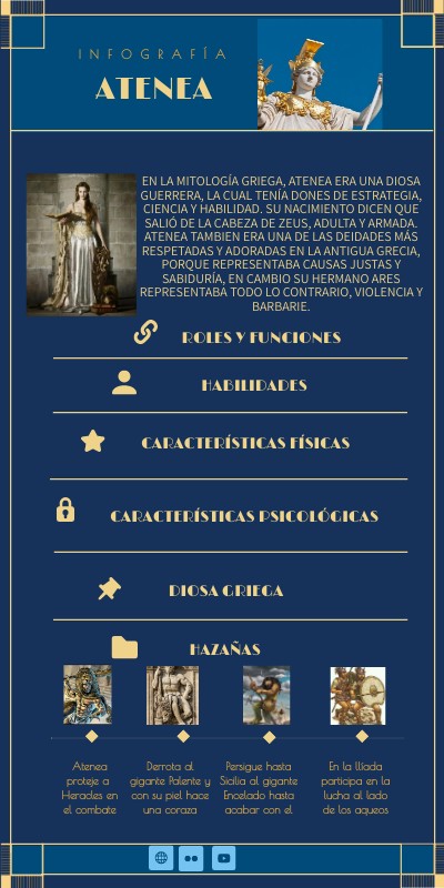 En la mitología griega, atenea era una diosa guerrera, la cual tenía dones de estrategia, ciencia y habilidad. Su nacimiento dicen que salió de la cabeza de zeus, adulta y armada. atenea tambien era una de las deidades más respetadas y adoradas en la antigua grecia, porque representaba causas justas y sabiduría, en cambio su hermano ares representaba todo lo contrario, violencia y barbarie.