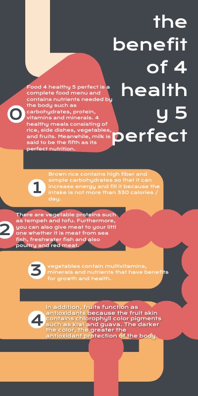 Food 4 healthy 5 perfect is a complete food menu and contains nutrients needed by the body such as carbohydrates, protein, vitamins and minerals. 4 healthy meals consisting of rice, side dishes, vegetables, and fruits. Meanwhile, milk is said to be the fifth as its perfect nutrition.