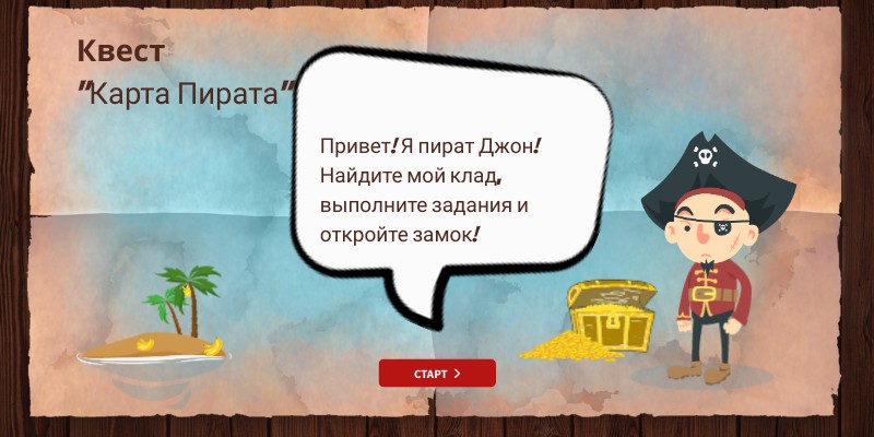 Привет! Я пират Джон! Найдите мой клад, выполните задания и откройте замок!