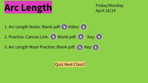 1. Arc Length Notes: Blank pdf: Video: 2. Practice: Canvas Link: Blank pdf: Key: 3. Arc Length Maze Practice: Blank pdf: Key: