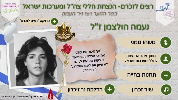 שם החלל שבחרתי להנציח: נעמה הולצמן מדוע בחרתי להנציח חלל זה: ראיתי כי נעמה אהבה מחשבים ואלקטרוניקה וזה דבר שיכלתי להזדהות איתו, בנוסף הבעתי אהדה לכך שעם מות אביה המשיכה לשרת ברצון רב בצה"ל. לפי סיפור חייה היא נראת לי בעלת אישיות חזקה ולכן בחרתי להנציח אותה. למדתי עליה שהיא היתה ילדה יפה, מקובלת בחברה, מלאת שמחת חיים ואהבה לטבע, לסביבה ולמשפחה. היא היתה חברה בתנועת הצופים ובחוג המשוטטים של 'אגד' ובמסגרת זו הרבתה לצאת לטיולים ולמסעות. עורכת: אינס נועה גולן, תלמידת כיתה יא"8