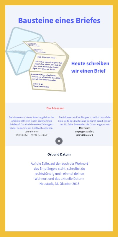 Dein Name und deine Adresse gehören bei offiziellen Briefen in den sogenannten Briefkopf. Das sind die ersten Zeilen ganz oben. So könnte ein Briefkopf aussehen:Laura Winter Waldstraße 1, 01234 Neustadt