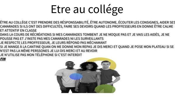 Être au collége c'est prendre des résponssabilité, être autonome, écouter les consignes, aider ses camarades si ils ont des difficultés, faire ses devoirs quand les proffesseurs en donne être calme et attentif en classe Dans la cours de récréations si mes camarades tombent je ne moque pas et je vais les aidés, je ne pousse pas et j'inste pas mes camarades ni les surveillants Je respecte les proffesseur, je leurs répond pas méchamant Si je mange à la cantine quan on me donne mon repas je dis merci et quand je pose mon plateau si se n'est pas la même perssones je lui dis merci et au revoir je n'utilise pas mon téléphone si c'est interdit FIN