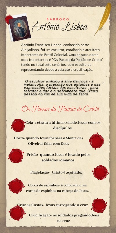 Antônio Francisco Lisboa, conhecido como Aleijadinho, foi um escultor, entalhado e arquiteto importante do Brasil Colonial. Uma de suas obras mais importantes é "Os Passos da Paixão de Cristo", tendo no total sete cenários, com esculturas representando desde a ceia até a crucificação.