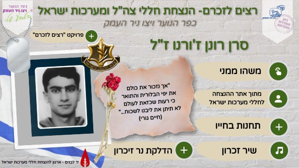 שם החלל שבחרנו להנציח: סרן רונן ז'ורנו ז"ל מדוע בחרתי להנציח חלל זה: בחרנו להנציח חלל זה, מפני שהכרנו אותו דרך חבר של אבא של ליה, וקראנו עליו באתר יזכור ושם למדנו שרונן היה אדם חייכן ושמח ואהוד על חבריו וקצין מעולה. בדיוק למדנו בשיעור על שם טוב ואנחנו מבינות איזה שם טוב היה לו. רונן נפל במהלך משימה צבאית חשובה במטרה לשבש את מערכי פעולות המחבלים בחיזבאללה ונפגע ממטען רב עוצמה, אנחנו מבינות שגם היה אמיץ מאוד ובגלל כל הדברים שציינו אנו מעריכות אותו מאוד. עורך: ליה משען והילה שנהב