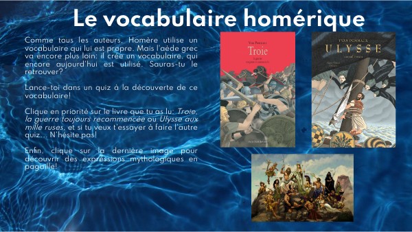 Comme tous les auteurs, Homère utilise un vocabulaire qui lui est propre. Mais l'aède grec va encore plus loin: il crée un vocabulaire, qui encore aujourd'hui est utilisé. Sauras-tu le retrouver? Lance-toi dans un quiz à la découverte de ce vocabulaire! Clique en priorité sur le livre que tu as lu: Troie, la guerre toujours recommencée ou Ulysse aux mille ruses, et si tu veux t'essayer à faire l'autre quiz... N'hésite pas! Enfin, clique sur la dernière image pour découvrir des expressions mythologiques en pagaille!