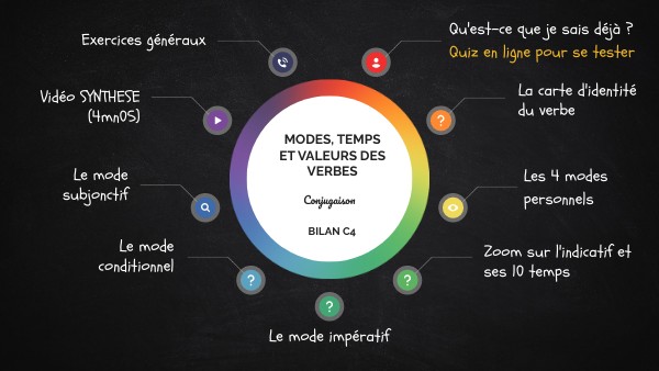 Les verbes sont classés en temps simples et en temps composés (conjugués avec "avoir" ou "être" + participe passé). A chaque temps simple correspond un temps composé : c'est l'auxiliaire qui se conjugue au temps simple associé. L'indicatif est le mode qui contient le plus de temps.