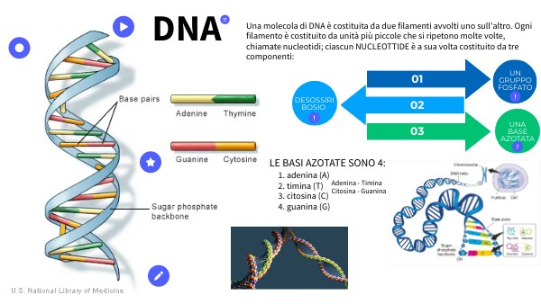 Una molecola di DNA è costituita da due filamenti avvolti uno sull'altro. Ogni filamento è costituito da unità più piccole che si ripetono molte volte, chiamate nucleotidi; ciascun NUCLEOTTIDE è a sua volta costituito da tre componenti: