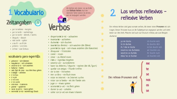 Die reflexiv Verben sind ganz normale verben, die immer einen Pronomen mit sich tragen. Dieser Pronome muss an die Subjektperson angepasst werden und steht immer vor dem Verb. Manche sind auch auf Deutsch reflexiv, wie zum Beispiel ducharse: