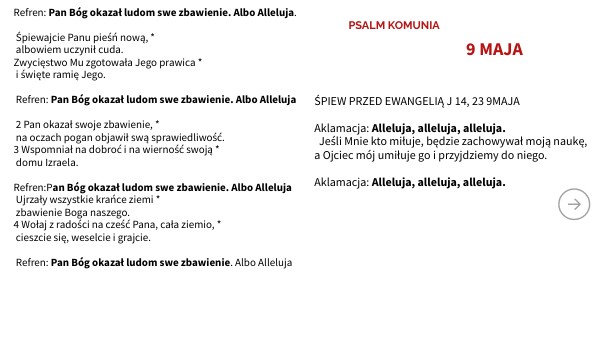 Refren: Pan Bóg okazał ludom swe zbawienie. Albo Alleluja. Śpiewajcie Panu pieśń nową, * albowiem uczynił cuda. Zwycięstwo Mu zgotowała Jego prawica * i święte ramię Jego. Refren: Pan Bóg okazał ludom swe zbawienie. Albo Alleluja 2 Pan okazał swoje zbawienie, * na oczach pogan objawił swą sprawiedliwość. 3 Wspomniał na dobroć i na wierność swoją * domu Izraela. Refren:Pan Bóg okazał ludom swe zbawienie. Albo Alleluja Ujrzały wszystkie krańce ziemi * zbawienie Boga naszego. 4 Wołaj z radości na cześć Pana, cała ziemio, * cieszcie się, weselcie i grajcie. Refren: Pan Bóg okazał ludom swe zbawienie. Albo Alleluja