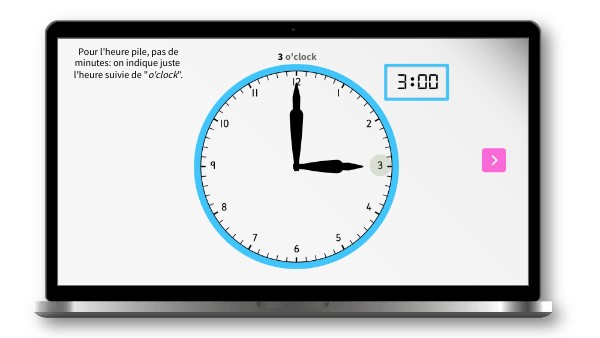 Pour l'heure pile, pas de minutes: on indique juste l'heure suivie de "o'clock".