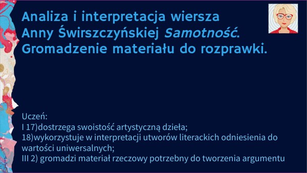 Uczeń: I 17)dostrzega swoistość artystyczną dzieła; 18)wykorzystuje w interpretacji utworów literackich odniesienia do wartości uniwersalnych; III 2) gromadzi materiał rzeczowy potrzebny do tworzenia argumentu