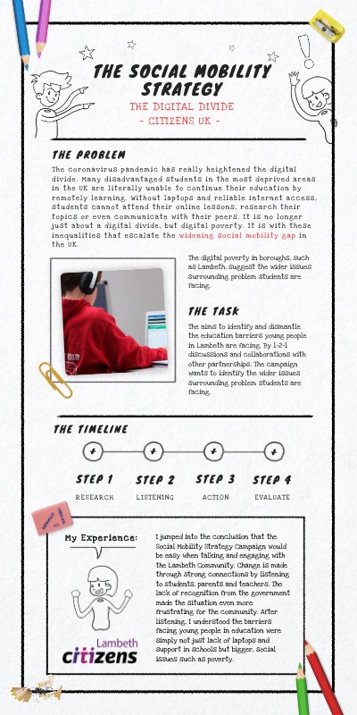 I jumped into the conclusion that the Social Mobility Strategy Campaign would be easy when talking and engaging with the Lambeth Community. Change is made through strong connections by listening to students, parents and teachers. The lack of recognition from the government made the situation even more frustrating for the community. After listening, I understood the barriers facing young people in education were simply not just lack of laptops and support in schools but bigger, social issues such as poverty.