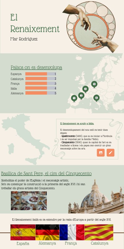 El Renaixement va sorgir a Itàlia.El desenvolupament del nou estil va tenir dues etapes: - Quattrocento (1400), que es va iniciar a Florència i va ser impulsat per la família Mèdici. - Cinquecento (1500), quan la capital de l'art es va traslladar a Roma i els papes van exercir un gran mecenatge sobre les arts.
