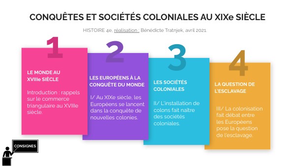 ÉTAPE n°1 : Dans ton cahier, écris le titre du chapitre en rouge sur une nouvelle page. Chapitre n°7 : Conquêtes et sociétés coloniales au XIXe siècle ÉTAPE n°2 : Visionne la vidéo. Cette vidéo a pour objectif de te rappeler les connaissances du chapitre n°1. ÉTAPE n°3 : Dans ton cahier, saute deux lignes et coller la frise chronologique n°7a. ÉTAPE n°4 : Dans ton cahier, va à la ligne et écris la trace écrite en bleu. Au XVIIIe siècle, le commerce international est dominé par les Européens, qui mettent en valeur des terres colonisées sur les littoraux des autres continents. Cette mise en valeur des colonies entraîne une croissance des échanges maritimes, l'enrichissement des ports atlantiques européens et l'essor d'une bourgeoisie marchande. Ce commerce repose sur le développement du système esclavagiste dans les colonies et l'essor de la traite négrière par les Européens. Sources de richesses pour l'Europe, les colonies deviennent aussi une source de rivalités entre les puissances européennes. Au début du XIXe siècle, cette domination du monde par les Européens s'accélère avec la "course aux colonies".