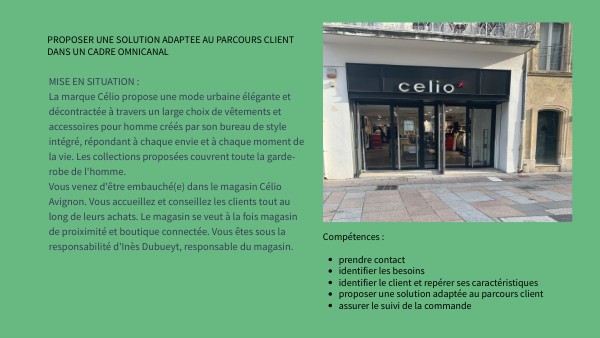 MISE EN SITUATION :La marque Célio propose une mode urbaine élégante et décontractée à travers un large choix de vêtements et accessoires pour homme créés par son bureau de style intégré, répondant à chaque envie et à chaque moment de la vie. Les collections proposées couvrent toute la garde-robe de l'homme. Vous venez d'être embauché(e) dans le magasin Célio Avignon. Vous accueillez et conseillez les clients tout au long de leurs achats. Le magasin se veut à la fois magasin de proximité et boutique connectée. Vous êtes sous la responsabilité d'Inès Dubueyt, responsable du magasin.
