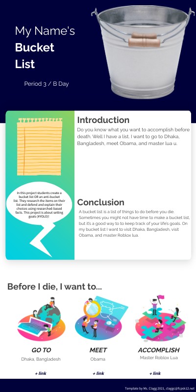 A bucket list is a list of things to do before you die. Sometimes you might not have time to make a bucket list, but it’s a good way to to keep track of your life’s goals. On my bucket list I want to visit Dhaka, Bangladesh, visit Obama, and master Roblox lua.