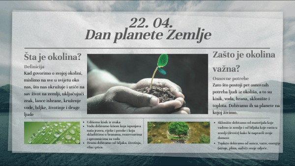 Kad govorimo o svojoj okolini, mislimo na sve u svijetu oko nas, što nas okružuje i utiče na sav život na zemlji, uključujući zrak, lance ishrane, kruženje vode, biljke, životinje i druge ljude