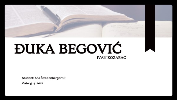 Ivan Kozarac hrvatski je romanopisac i pripovjedač. Rodio se 1885. godine u Vinkovcima. Njegov život je bio težak i kratak, uspijevao se boriti protiv siromaštva, ali nije mogao pobijediti bolest. Kratko vrijeme proveo je u vojsci, ali pošto je bio krhkog zdravlja, ubrzo se vraća u Zagreb gdje je nastavio službu. 1910. godine vratio se u rodne Vinkovce već jako bolestan. Već je par godina bio bolovao od tuberkuloze, a želja mu je bila da kraj svog života dočeka u svom rodnom kraju. Vinkovci su mu bili izvor inspiracija, kako stvaralačkih, tako i životnih. Krajem 1910. godine je umro i to samo s 25 godina. Osim pjesama, od proze je napisao nekoliko novela i psihološki roman “Đuka Begović”, koje je njegovo najpoznatije djelo. U njemu je došao do izražaja sav njegov talent pa se s pravom ovo djelo ubraja u najuspješnija djela hrvatske književnosti.