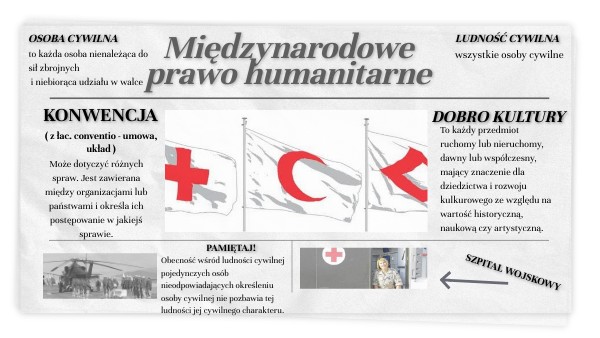 Powstanie międzynarodowego prawa humanitarnego miało na celu ograniczenie tragicznych następstw wojny. W 1864 r. odbyła się w Genewie pierwsza konferencja międzynarodowego prawa humanitarnego, na której przyjęło konwencję o ochronie rannych i chorych żołnierzy. Kolejne trzy konwencje genewskie określały zasady postępowania wobec ofiar wojny. Protokół dodatkowych I określa zasady postępowania i ochrony ofiar międzynarodowych konfliktów zbrojnych. Protokół dodtkowy II dotyczy ofiar niemiędzynarodowych konfliktów zbrojnych. Protokół dodatkowy III wprowadza znak czerwonego kryształu. Łamanie międzynarodowego prawa humanitarnego skutkouje odpowiedzialnością prawną. Międzynarodowy Komitet Czerwonego Krzyża ( MKCK ) pełni funkcję neutralnego pośrednika w międzynarodowych i wewnętrznych konfliktach zbrojnych oraz prowadzi akcje humanitarne, niosąc pomoc ofiarą wojen. Konferencja haska z 1954 r. wprowadziła prawną ochroną dóbr kultury. Ochroną dóbr kultury, będących dziedzictwem kulturalnym ludzkości, zajmuje się UNESCO - organizacja działająca w ramach ONZ. Jej zasługą jest stworzenie Listy Światowego Dziedzictwa.