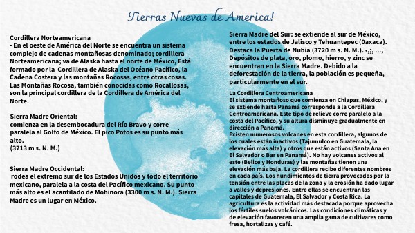 La Cordillera de los Andes - es una cadena montañosa en Chile. Las nuevas tierras de América culminan en la cadena montañosa más larga del continente y del mundo, las Anes (7240 km). Los Andes se elevan paralelamente a la costa del Pacífico, invadiendo territorio venezolano, colombiano, ecuatoriano, peruano, boliviano, chileno y argentino. La Cordillera se divide en tres secciones: • Andes Septentrionales Desde Mértda (Venezuela) a la Sierra Ecuador. - Hay volcanes activos como el Chimborazo (6310 m s. N. M. En Ecuador). • Andes centrales. Bolivia y Abarcan Per. El punto más alto del Perú es el Nevado Huascarán (6768 m s. N. M.). Esta zona es conocida como el Altiplano, y contiene el Lago Titicaca ... • Los Andes del Sur. Comienzan cerca de la frontera entre Bolivia, Chile y Argentina. - El punto más alto de la Cordillera y del continente se encuentra aquí: Aconcagua (6960 m s. N. M.), En Argentina. Algunos centros de población notables incluyen Bogotá. La minería y la agricultura están tan cerca como ... (Colombia), Quito (Ecuador), Lima (Perú), La Paz (Bohvia) y Santiago (Chile).